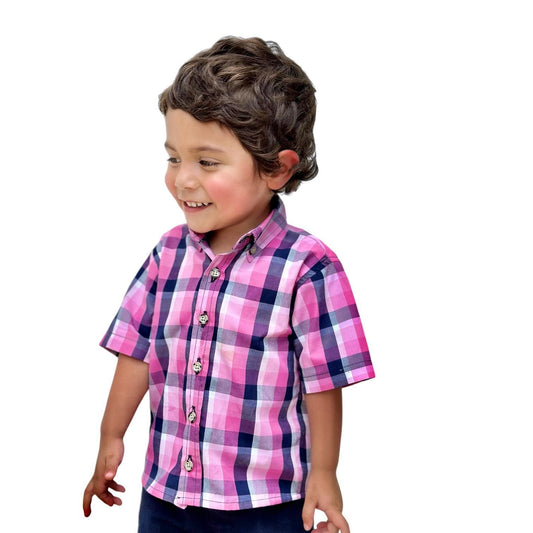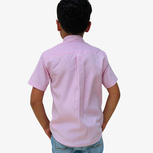 Boys' Button Down Pink All-Season Gingham Plaid Short Sleeve